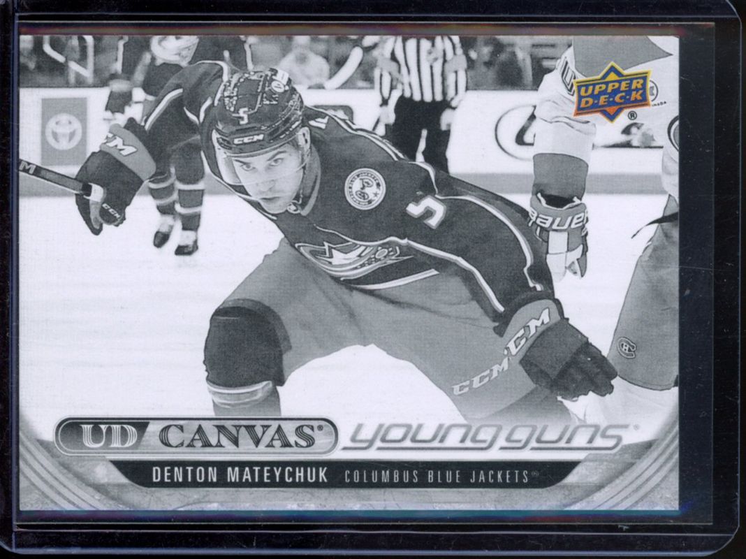 The Denton Mateychuk 2024 Upper Deck Extended Series #C347 UD Canvas - Black & White Rookie card is 1 of 43 Denton Mateychuk's card variations in the 2024 Upper Deck Extended Series set being tracked by Sports Card Investor, including Base, Young Guns Base, Clear Cut, Outburst, and Young Guns - Clear Cut.