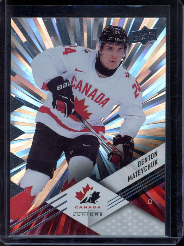The Denton Mateychuk 2024 Upper Deck Team Canada Juniors #7 Base Rookie card is 1 of 108 Denton Mateychuk's card variations in the 2024 Upper Deck Team Canada Juniors set being tracked by Sports Card Investor, including #74 Base, #102 Base, #42 Base, #74 Autographs Patch, and #7 Autographs Patch.