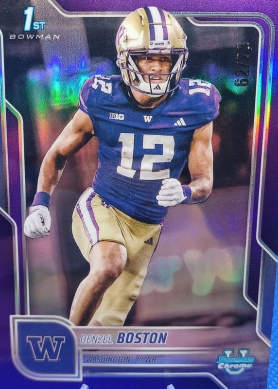 Best Prices Available For Sale of Denzel Boston 2025 Bowman Chrome University #34 Purple Refractor /75 (1st)