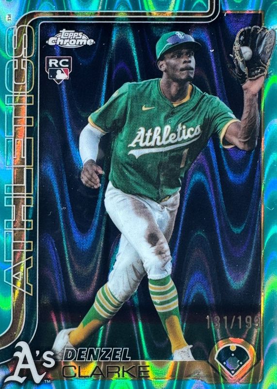 The Denzel Clarke 2025 Topps Chrome Update #USC15 Aqua RayWave Refractor /199 Rookie card in Raw condition has not changed in price in the last 30 days and was last sold for $0.99 .