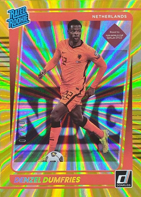 The Denzel Dumfries 2021 Donruss #178 Holo Gold Laser /10 Rookie card in Raw condition has not changed in price in the last 30 days and was last sold for $81.00 .