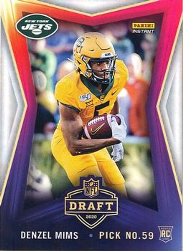 The Denzel Mims 2020 Panini Instant Draft Night #21 Base Rookie card is 1 of 3 Denzel Mims' card variations in the 2020 Panini Instant Draft Night set being tracked by Sports Card Investor, including Green /10, and Black /1.