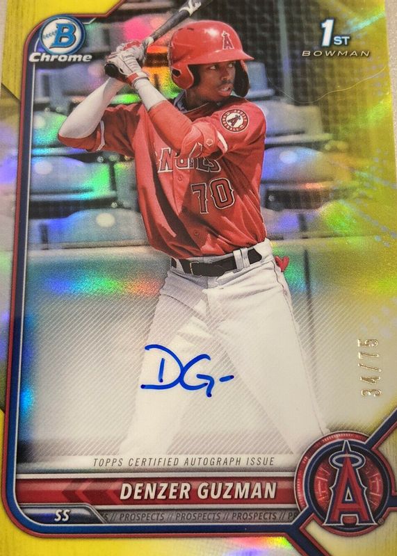 Denzer Guzman's Baseball cards are available in at least 4 sets. Denzer Guzman's biggest 7-day price movers are 2022 Bowman #CPA-DG Chrome Prospect Auto - Yellow Refractor /75 (1st), 2022 Bowman #CPA-DG Chrome Prospect Auto - Atomic Refractor /100 (1st), and 2022 Bowman #CPA-DG Chrome Prospect Auto - Purple Refractor /250 (1st).