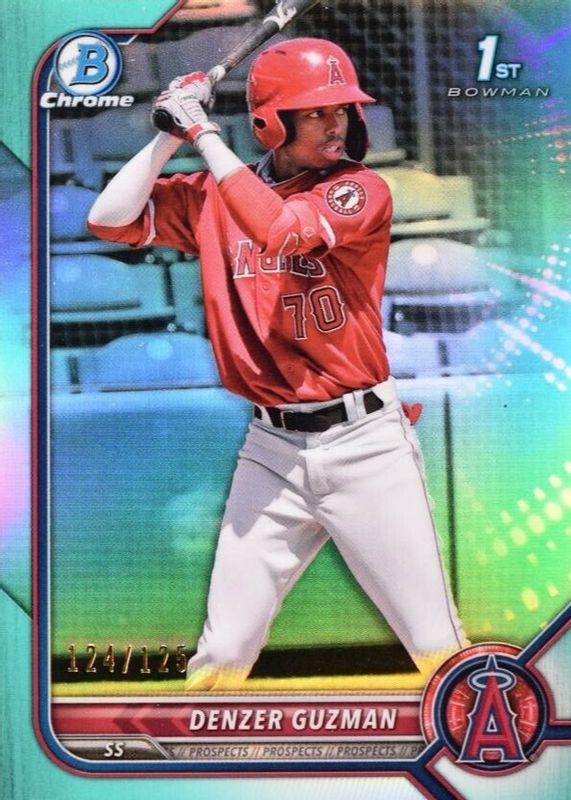 The Denzer Guzman 2022 Bowman #BCP-138 Chrome Prospects - Aqua Refractor /125 (1st) card in Raw condition has not changed in price in the last 30 days and was last sold for $3.26 .