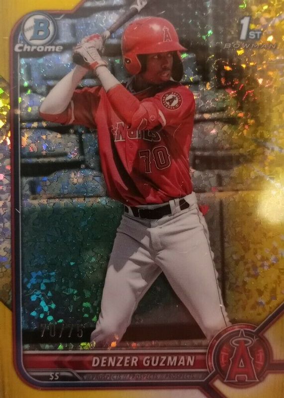 The Denzer Guzman 2022 Bowman #BCP-138 Chrome Prospects - Yellow Mini-Diamond Refractor /75 (1st) card in Raw condition has not changed in price in the last 30 days and was last sold for $8.39 .
