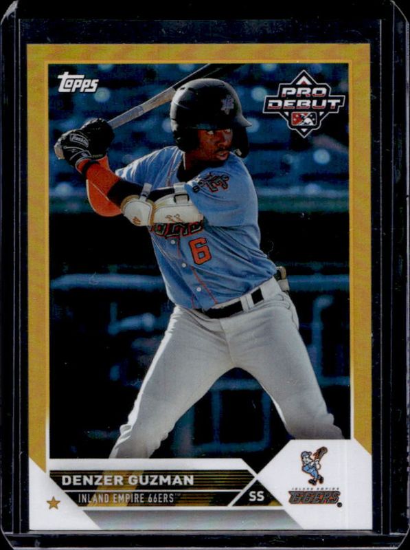 The Denzer Guzman 2023 Topps Pro Debut #PD-30 Gold /50 card is 1 of 20 Denzer Guzman's card variations in the 2023 Topps Pro Debut set being tracked by Sports Card Investor, including Base, Fuchsia /199, Sparkle /175, Blue /150, and Green /99.