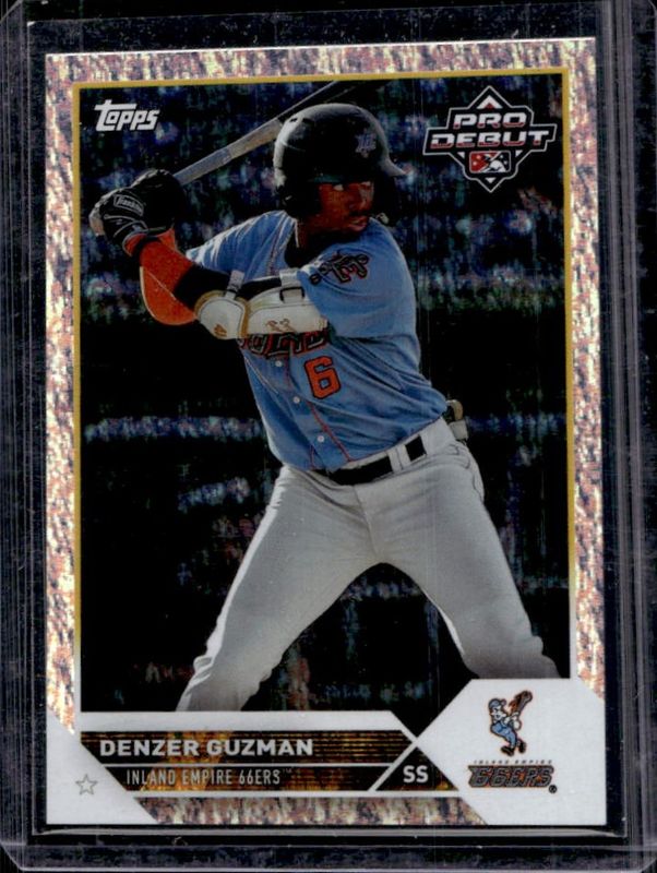The Denzer Guzman 2023 Topps Pro Debut #PD-30 Sparkle /175 card is 1 of 20 Denzer Guzman's card variations in the 2023 Topps Pro Debut set being tracked by Sports Card Investor, including Base, Fuchsia /199, Blue /150, Green /99, and Aqua /75.