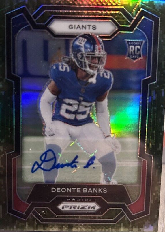 The Deonte Banks 2023 Prizm #376 Rookie Autographs - Camo /25 card in Raw condition has not changed in price in the last 30 days and was last sold for $52.00 .