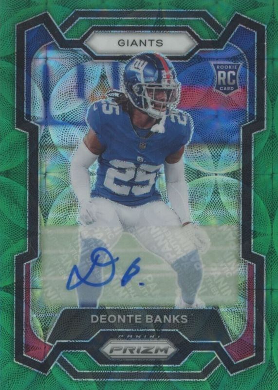 The Deonte Banks 2023 Prizm #376 Rookie Autographs - Green Scope /75 card in Raw condition has not changed in price in the last 30 days and was last sold for $6.50 .