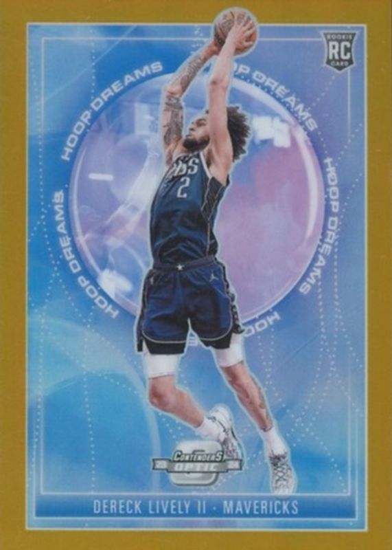 The Dereck Lively II 2023 Contenders Optic #14 Hoop Dreams - Gold /10 Rookie card in Raw condition has not changed in price in the last 30 days and was last sold for $26.00 .