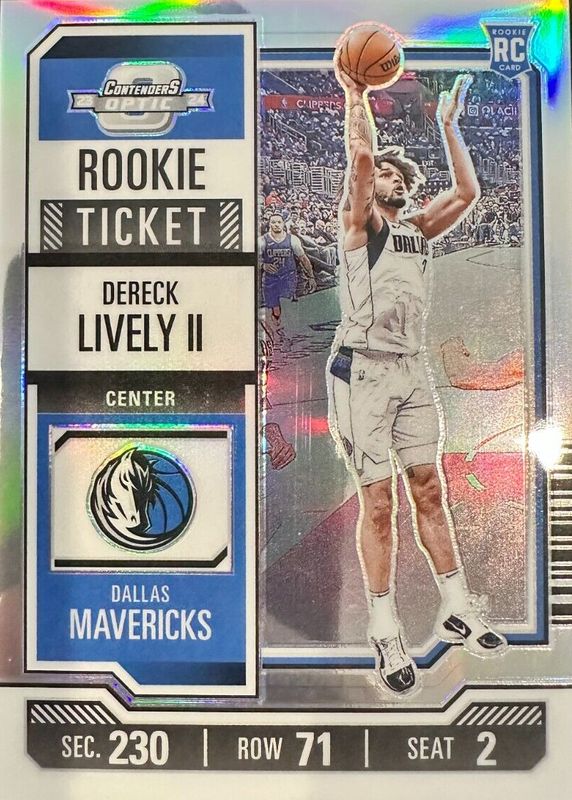 The Dereck Lively II 2023 Contenders Optic #7 Rookie Ticket - Silver card in Raw condition has not changed in price in the last 30 days and was last sold for $1.69 .