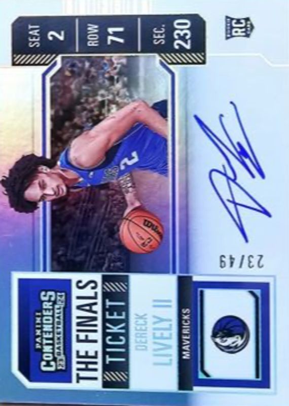 The Dereck Lively II 2023 Contenders #143 Rookie Ticket Auto Variation - Finals Ticket /49 card in Raw condition has not changed in price in the last 30 days and was last sold for $122.50 .