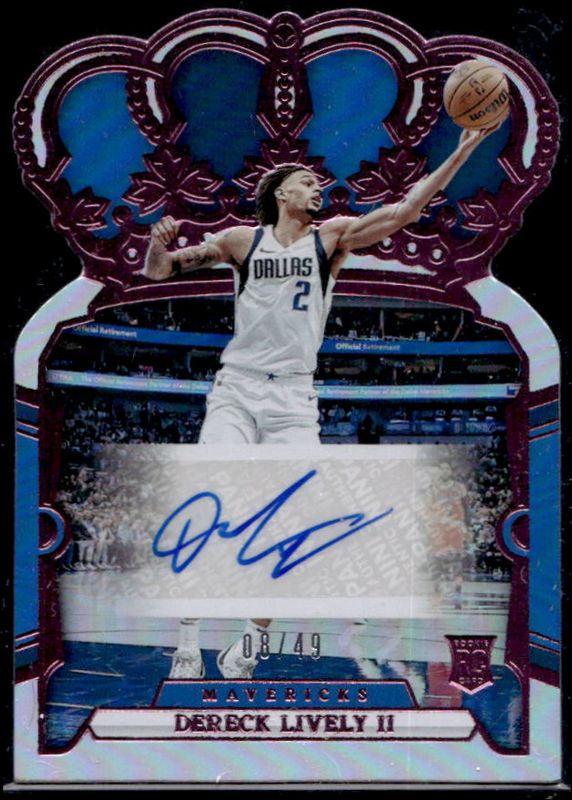 The Dereck Lively II 2023 Crown Royale #RC-LIV Rookie Crown Autographs - Pink /49 card is 1 of 63 Dereck Lively II's card variations in the 2023 Crown Royale set being tracked by Sports Card Investor, including #105 Base, #5 Base, #5 Crystal, #5 International Red, and #5 Royalty.