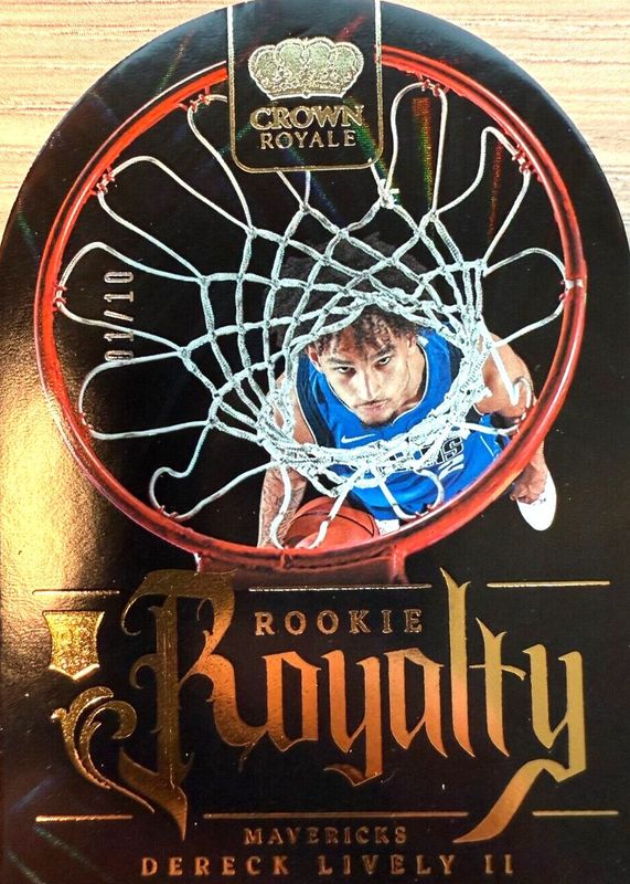 The Dereck Lively II 2023 Crown Royale #28 Rookie Royalty - Gold /10 card in Raw condition has not changed in price in the last 30 days and was last sold for $72.00 .