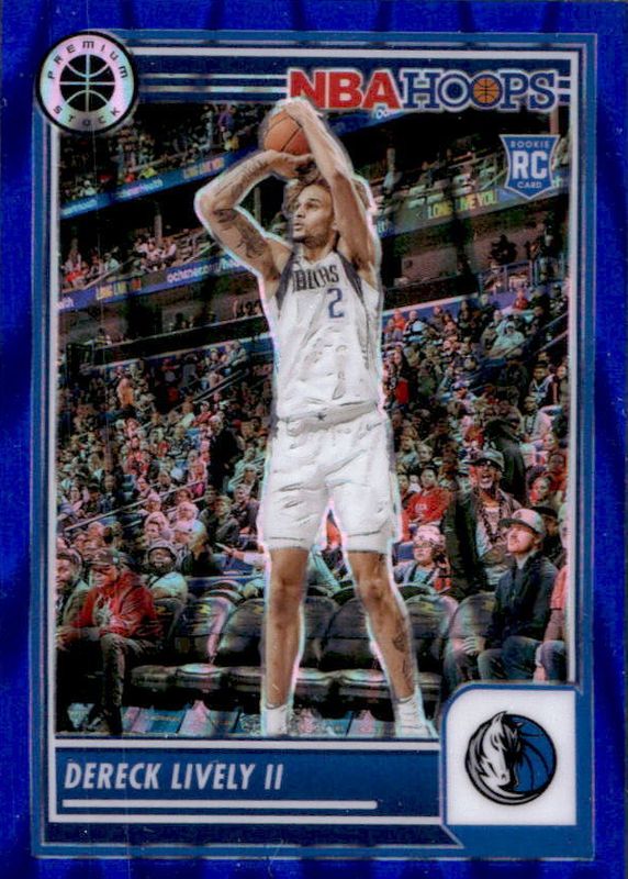 The Dereck Lively II 2023 Hoops Premium Stock #253 Blue Seismic /99 Rookie card in Raw condition has not changed in price in the last 30 days and was last sold for $10.50 .