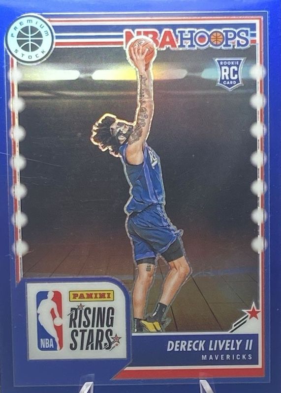 The Dereck Lively II 2023 Hoops Premium Stock #291 Rising Stars - Blue /120 Rookie card in Raw condition has not changed in price in the last 30 days and was last sold for $1.25 .