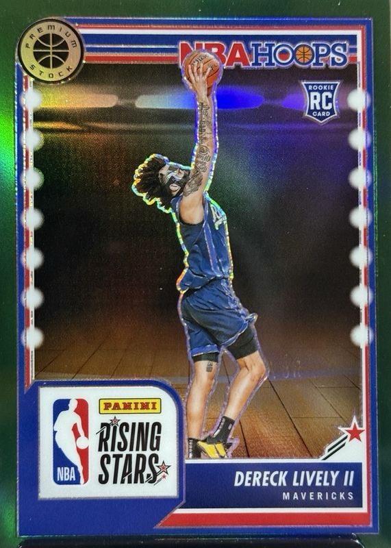 The Dereck Lively II 2023 Hoops Premium Stock #291 Rising Stars - Green /75 Rookie card in Raw condition has not changed in price in the last 30 days and was last sold for $5.00 .