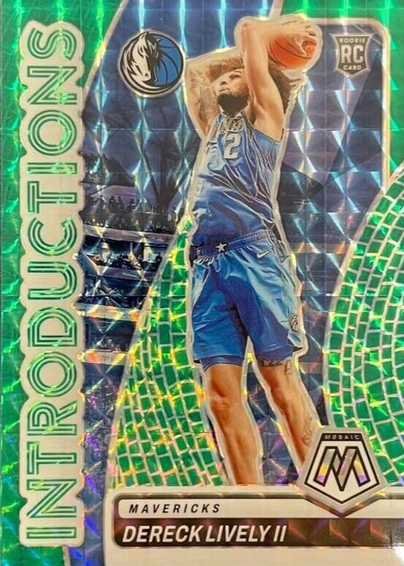 The Dereck Lively II 2023 Mosaic #1 Introductions - Teal /75 Rookie card in Raw condition has not changed in price in the last 30 days and was last sold for $3.25 .