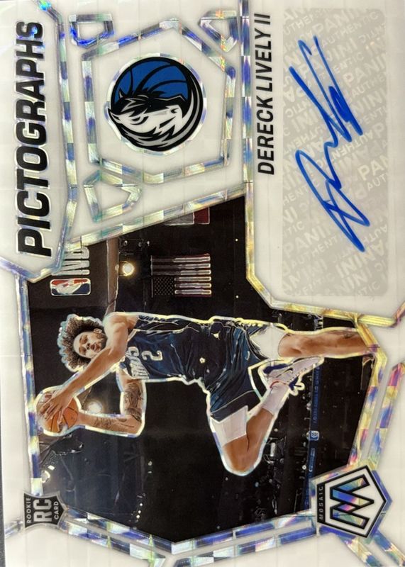The Dereck Lively II 2023 Mosaic #PM-LIV Pictographs Autographs - White /25 Rookie card in Raw condition has not changed in price in the last 30 days and was last sold for $152.50 .