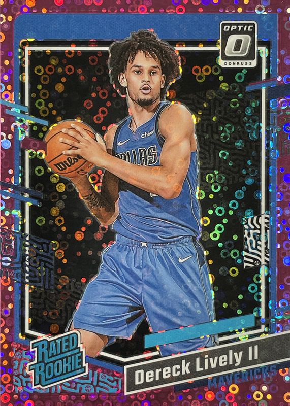 The Dereck Lively II 2023 Optic #245 Fast Break Pink /25 Rookie card in Raw condition has not changed in price in the last 30 days and was last sold for $12.50 .