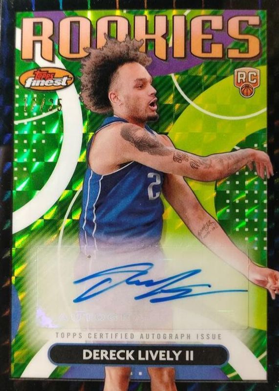 The Dereck Lively II 2023 Topps Finest #RFA-DL Rookie Finest Autographs - Black Geometric Refractor /25 card in Raw condition has not changed in price in the last 30 days and was last sold for $22.50 .