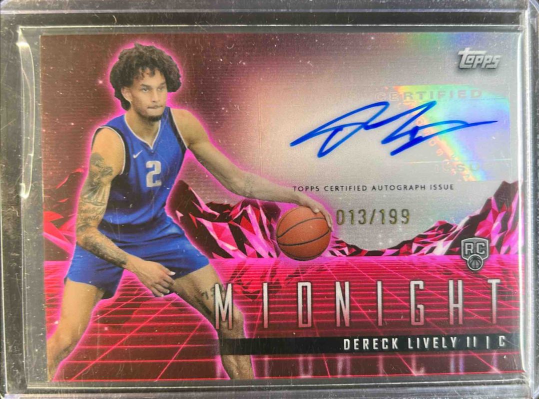 The Dereck Lively II 2023 Topps Midnight #RHS-DLII Rookie Horizon Signatures - Twilight /199 card is 1 of 38 Dereck Lively II's card variations in the 2023 Topps Midnight set being tracked by Sports Card Investor, including Base, Moon Beam, Zodiac, Morning /149, and Twilight /99.
