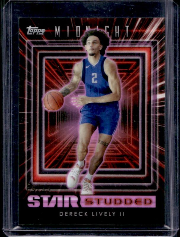 The Dereck Lively II 2023 Topps Midnight #SS-28 Star Studded - Twilight /99 Rookie card is 1 of 38 Dereck Lively II's card variations in the 2023 Topps Midnight set being tracked by Sports Card Investor, including Base, Moon Beam, Zodiac, Morning /149, and Twilight /99.