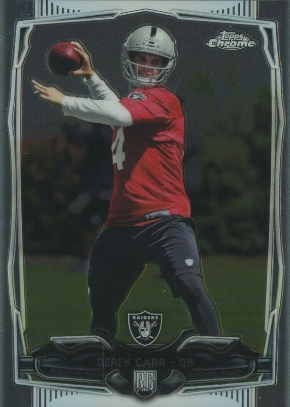 The Derek Carr 2014 Topps Chrome #115 Base Rookie card in Raw condition has moved up $0.55 (+55.0%) in the last 30 days and was last sold for $1.55 .