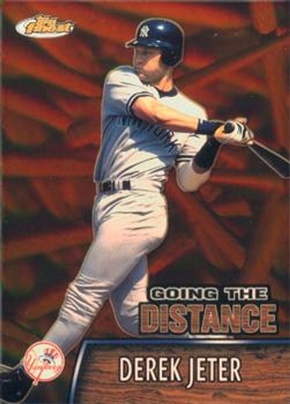 The Derek Jeter 2000 Topps Finest #GTD3 Going the Distance card is 1 of 17 Derek Jeter's card variations in the 2000 Topps Finest set being tracked by Sports Card Investor, including #136 Base, #60 Base, #121 Base, #122 Base, and #PP5 Pre Production.