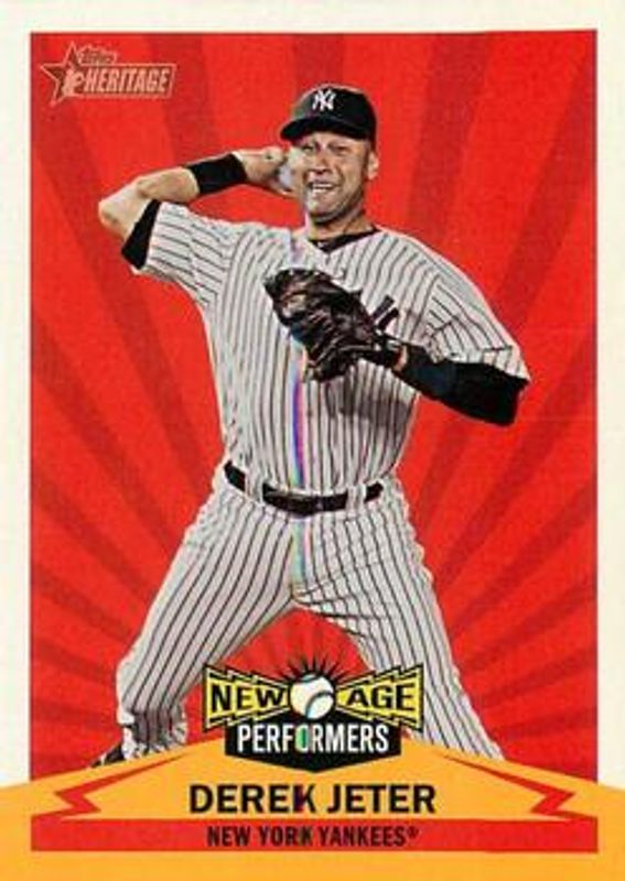 The Derek Jeter 2012 Topps Heritage #NAP-DJ New Age Performers card is 1 of 7 Derek Jeter's card variations in the 2012 Topps Heritage set being tracked by Sports Card Investor, including #20b Base, #20a Base, #HP33 Black, #HP33 Chrome /1963, and #HP33 Chrome Refractor /563.