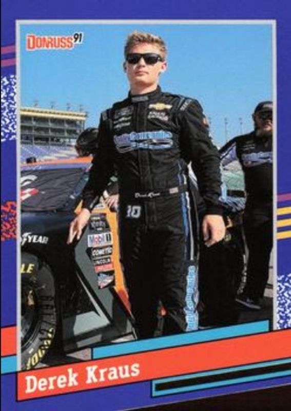 The Derek Kraus 2024 Donruss NASCAR #129 Blue /199 card is 1 of 34 Derek Kraus' card variations in the 2024 Donruss NASCAR set being tracked by Sports Card Investor, including Base, Optic, Optic Black Pandora, Optic Blue Velocity, and Optic Holo.