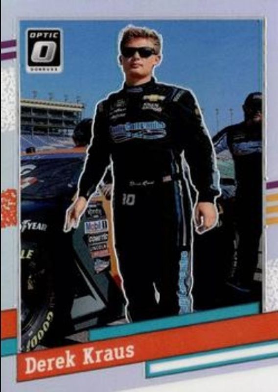 The Derek Kraus 2024 Donruss NASCAR #129 Optic Holo card is 1 of 34 Derek Kraus' card variations in the 2024 Donruss NASCAR set being tracked by Sports Card Investor, including Base, Optic, Optic Black Pandora, Optic Blue Velocity, and Optic Orange Velocity.