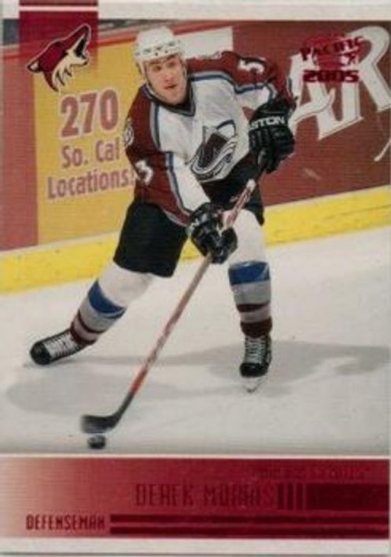 The Derek Morris 2004 Pacific #204 Red card is 1 of 3 Derek Morris' card variations in the 2004 Pacific set being tracked by Sports Card Investor, including Base, and Blue /250.
