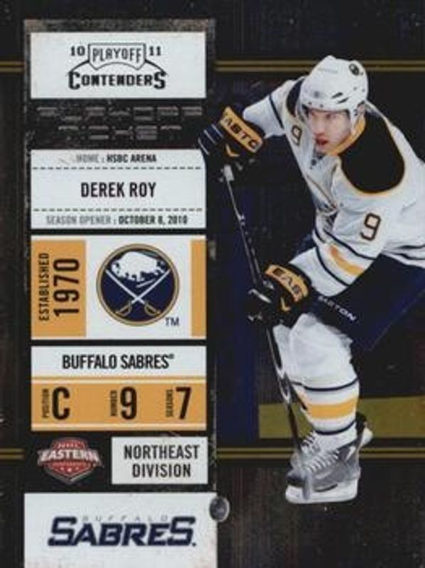 The Derek Roy 2010 Contenders #3 Playoff Tickets /100 card is 1 of 5 Derek Roy's card variations in the 2010 Contenders set being tracked by Sports Card Investor, including Base, Championship Tickets /1, The Great Outdoors, and The Great Outdoors Autographs /50.
