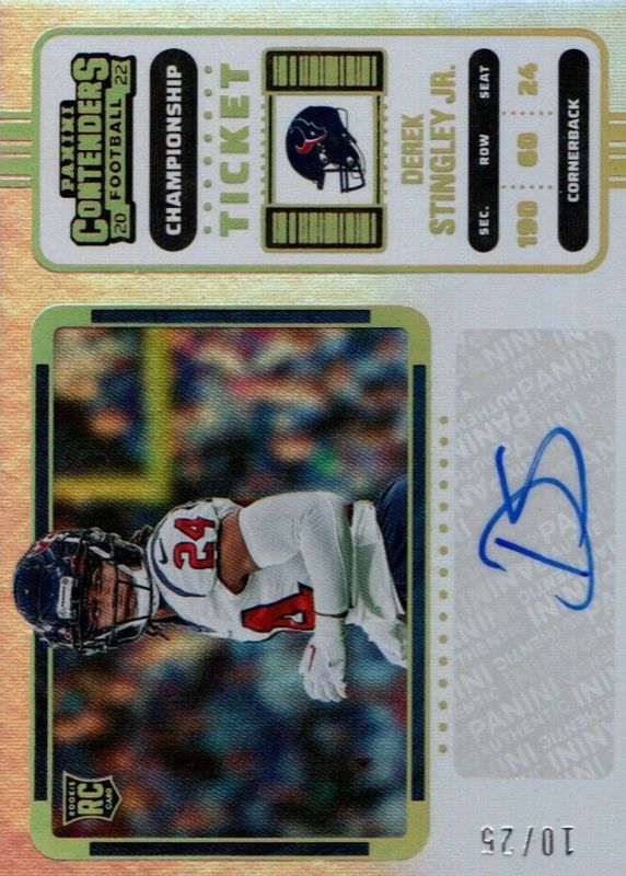 The Derek Stingley Jr. 2022 Contenders #144 Rookie Ticket Auto Variation - Championship Ticket /25 card in Raw condition has not changed in price in the last 30 days and was last sold for $14.25 .