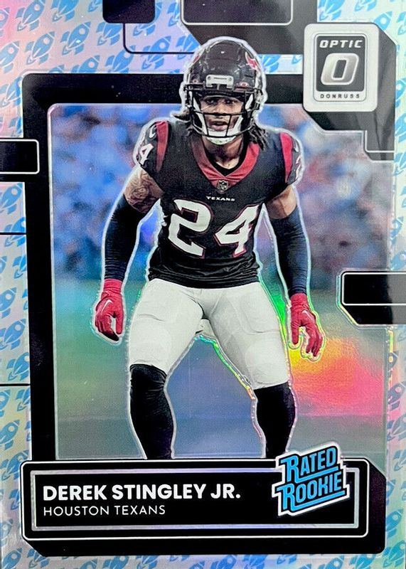 The Derek Stingley Jr. 2022 Optic #244 Rocket /(SSP) Rookie card in Raw condition has not changed in price in the last 30 days and was last sold for $13.52 .
