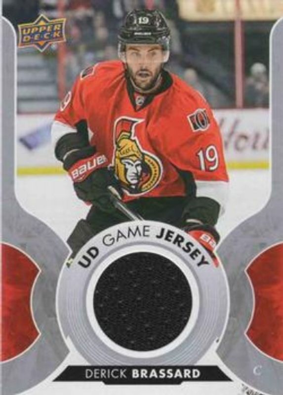 The Derick Brassard 2017 Upper Deck #GJ-BR UD Game Jerseys card is 1 of 14 Derick Brassard's card variations in the 2017 Upper Deck set being tracked by Sports Card Investor, including Base, Clear Cut, Gold Rainbow Foil, Silver Foil, and UD Exclusives /100.