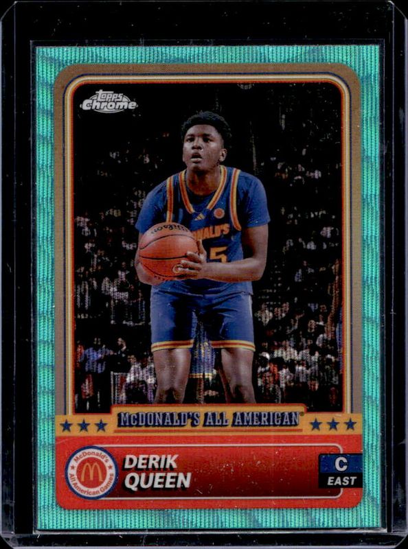 The Derik Queen 2024 Topps Chrome McDonald's All-American #32 Aqua Wave Refractor /199 card is 1 of 112 Derik Queen's card variations in the 2024 Topps Chrome McDonald's All-American set being tracked by Sports Card Investor, including #82 Base, #32 Base, #32 Blue RayWave Refractor, #82 Blue RayWave Refractor, and #32 McDonald's Logo Refractor.