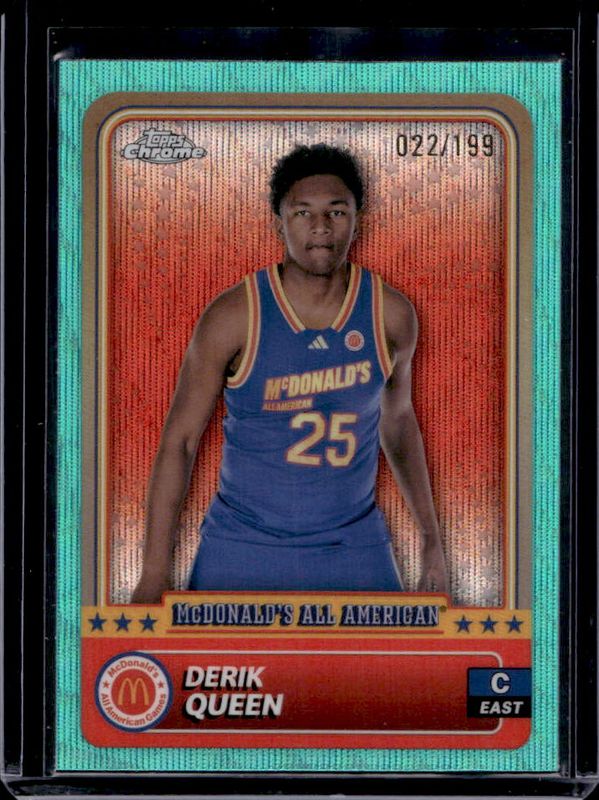 The Derik Queen 2024 Topps Chrome McDonald's All-American #82 Aqua Wave Refractor /199 card is 1 of 112 Derik Queen's card variations in the 2024 Topps Chrome McDonald's All-American set being tracked by Sports Card Investor, including #82 Base, #32 Base, #32 Blue RayWave Refractor, #82 Blue RayWave Refractor, and #32 McDonald's Logo Refractor.