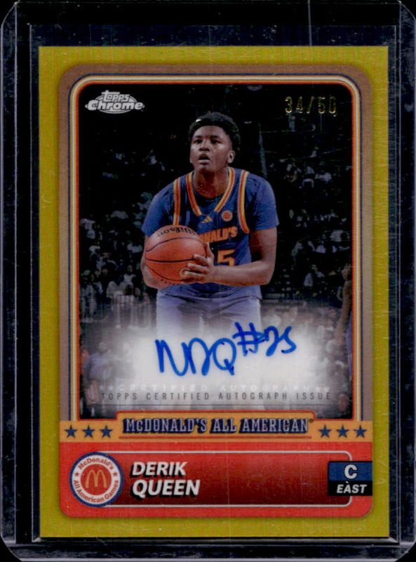 The Derik Queen 2024 Topps Chrome McDonald's All-American #32 Base Autographs - Gold Refractor /50 card is 1 of 112 Derik Queen's card variations in the 2024 Topps Chrome McDonald's All-American set being tracked by Sports Card Investor, including #82 Base, #32 Base, #32 Blue RayWave Refractor, #82 Blue RayWave Refractor, and #32 McDonald's Logo Refractor.