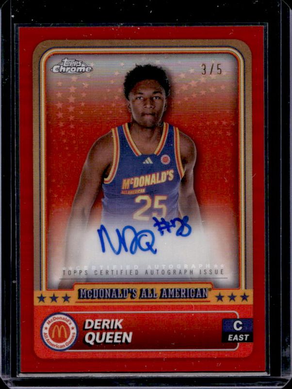 The Derik Queen 2024 Topps Chrome McDonald's All-American #82 Base Autographs - Red Refractor /5 card is 1 of 112 Derik Queen's card variations in the 2024 Topps Chrome McDonald's All-American set being tracked by Sports Card Investor, including #82 Base, #32 Base, #32 Blue RayWave Refractor, #82 Blue RayWave Refractor, and #32 McDonald's Logo Refractor.