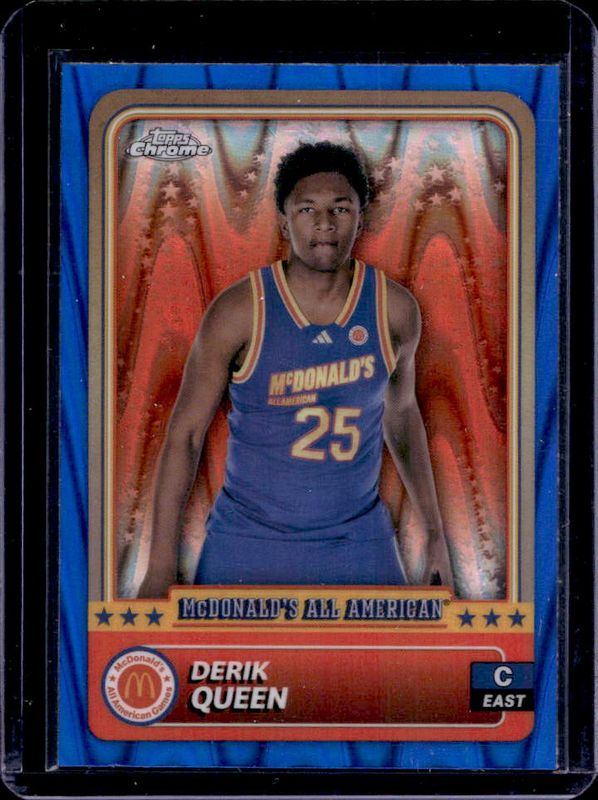 The Derik Queen 2024 Topps Chrome McDonald's All-American #82 Blue RayWave Refractor card is 1 of 112 Derik Queen's card variations in the 2024 Topps Chrome McDonald's All-American set being tracked by Sports Card Investor, including #82 Base, #32 Base, #32 Blue RayWave Refractor, #32 McDonald's Logo Refractor, and #82 McDonald's Logo Refractor.