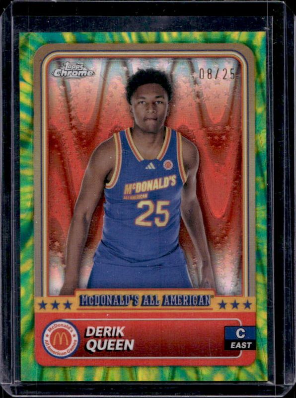 The Derik Queen 2024 Topps Chrome McDonald's All-American #82 Tie-Dye Refractor /25 card is 1 of 112 Derik Queen's card variations in the 2024 Topps Chrome McDonald's All-American set being tracked by Sports Card Investor, including #82 Base, #32 Base, #32 Blue RayWave Refractor, #82 Blue RayWave Refractor, and #32 McDonald's Logo Refractor.