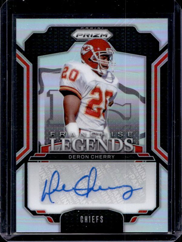 The Deron Cherry 2024 Prizm #FL-DCY Franchise Legends /149 card is 1 of 21 Deron Cherry's card variations in the 2024 Prizm set being tracked by Sports Card Investor, including Flashback Autographs /149, Sensational Signatures /149, Flashback Autographs - Blue Ice /99, Franchise Legends - Blue Ice /99, and Sensational Signatures - Blue Ice /99.