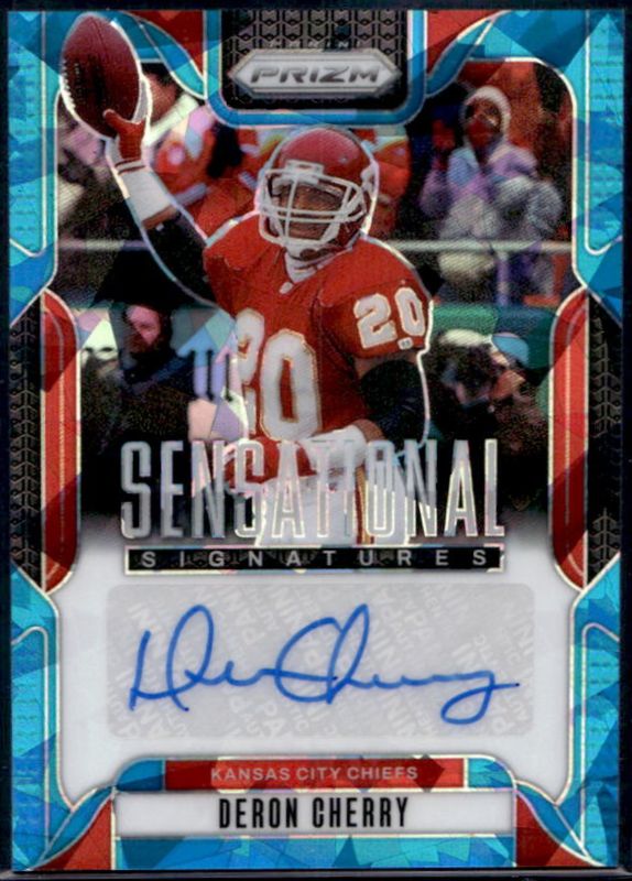 The Deron Cherry 2024 Prizm #SS-DCH Sensational Signatures - Blue Ice /99 card is 1 of 21 Deron Cherry's card variations in the 2024 Prizm set being tracked by Sports Card Investor, including Flashback Autographs /149, Franchise Legends /149, Sensational Signatures /149, Flashback Autographs - Blue Ice /99, and Franchise Legends - Blue Ice /99.