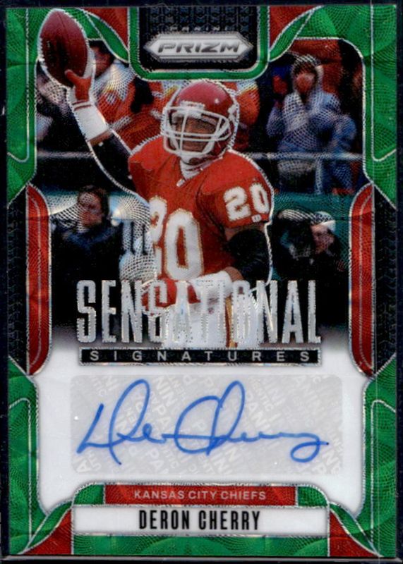 The Deron Cherry 2024 Prizm #SS-DCH Sensational Signatures - Green Scope /75 card is 1 of 21 Deron Cherry's card variations in the 2024 Prizm set being tracked by Sports Card Investor, including Flashback Autographs /149, Franchise Legends /149, Sensational Signatures /149, Flashback Autographs - Blue Ice /99, and Franchise Legends - Blue Ice /99.