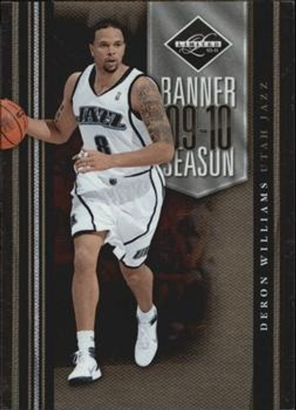 The Deron Williams 2010 Limited #19 Banner Season /149 card is 1 of 30 Deron Williams' card variations in the 2010 Limited set being tracked by Sports Card Investor, including Base /199, Silver Spotlight /149, Gold Spotlight /49, Platinum Spotlight /1, and Team Trademarks /149.