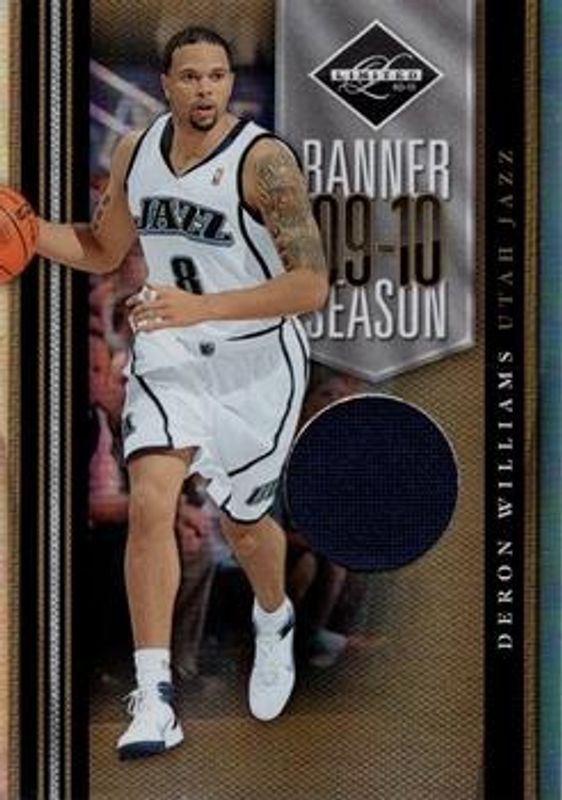 The Deron Williams 2010 Limited #19 Banner Season - Materials /99 card is 1 of 30 Deron Williams' card variations in the 2010 Limited set being tracked by Sports Card Investor, including Base /199, Silver Spotlight /149, Gold Spotlight /49, Platinum Spotlight /1, and Banner Season /149.