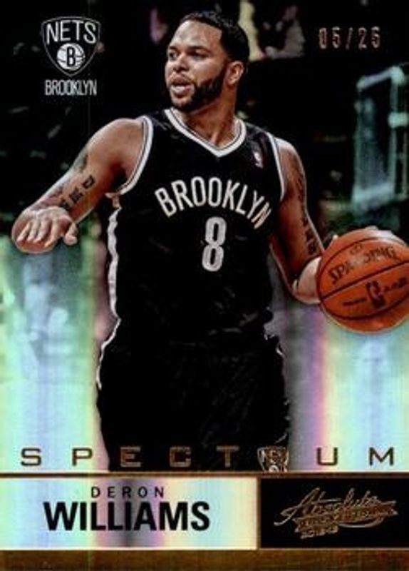 The Deron Williams 2012 Absolute #28 Spectrum Gold /25 card is 1 of 9 Deron Williams' card variations in the 2012 Absolute set being tracked by Sports Card Investor, including Base /399, Spectrum Platinum /10, Spectrum Black /1, Iconic Materials Autographs /74, and Hoopla Autographs /49.
