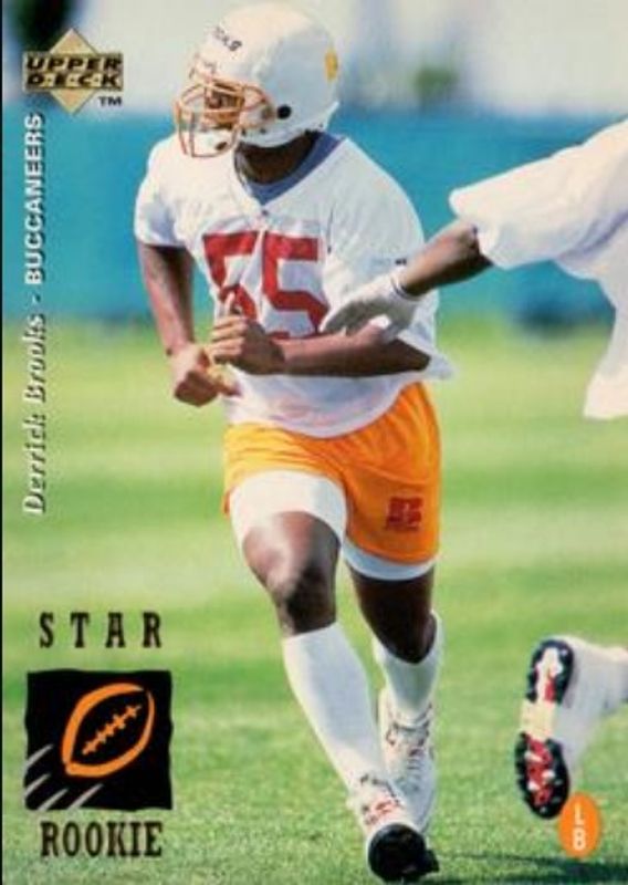 The Derrick Brooks 1995 Upper Deck #21 Base Rookie card is 1 of 3 Derrick Brooks' card variations in the 1995 Upper Deck set being tracked by Sports Card Investor, including Electric, and Electric Gold.